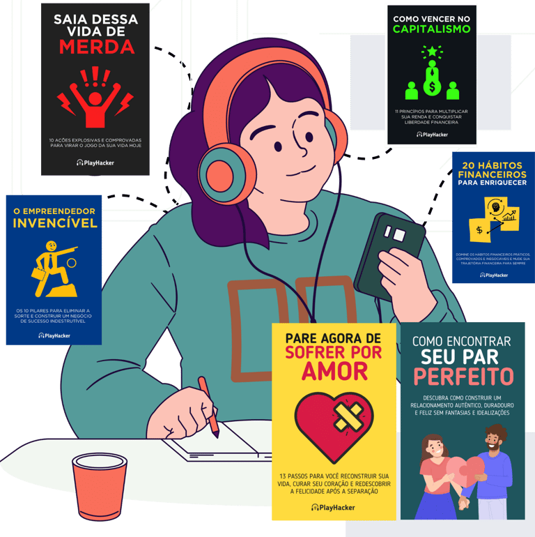 Você vai ter acesso ao Playhacker, um guia prático com 3 formatos: o audiolivro para ouvir em qualquer lugar, o ebook para ler e reler e o caderno de ativação digital para transformar a teoria em ação.